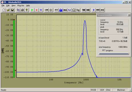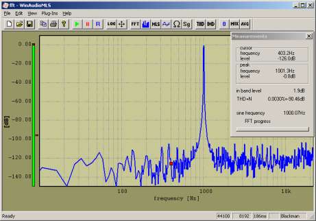 you get a THD+N close to the theoretical value (97dB). The input signal is a file with an ideal 1kHz sinus sampled with 16-bit. It can be easily seen that the noise introduced by the 32-bit FFT at 8192 exceeds the quantization noise and therefore degrades the THD+N measurement by 6dB. FFT size 1024 32-bit FFT THD+N 96dBFFT size 1024 64-bit FFT THD+N 96dBFFT size 8192 32-bit FFT THD+N 90dBFFT size 8192 64-bit FFT THD+N 97dB |