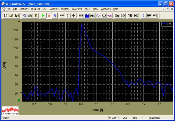 zeigt den zeitlichen Verlauf des Schallpegels nach Abschuß einer 6mm Pistole.