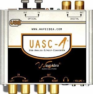 UASC-1 von WaveideaDas UASC-1 ist ein neues USB Sound System, das PCs, MACs oder Notebooks auf einfache Weise um analoge oder digitale Anschlüsse erweitert. Die digitalen Anschlüsse sind sowohl optisch als auch koaxial. Das UASC-1 benötigt kein Netzteil oder Treiber. Einfach an den USB Port anschließen. In Verbindung mit der geringen Größe und dem stabilem Aluminiumgehäuse, eignet sich das UASC-1 hervorragend für mobile Anwendungen.