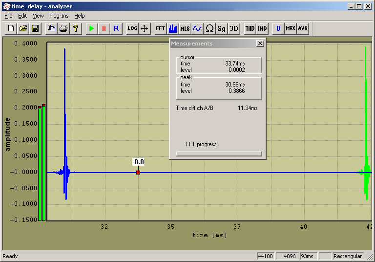 Measure time delayWinAudioMLS can measure time delay between its two input channels.The measurement is based on the powerful MLS technique, which is highly immune against noise. WinAudioMLS computes the impulse responses of both channels simultaneously. The time difference is displayed in the measurement window. Applications are